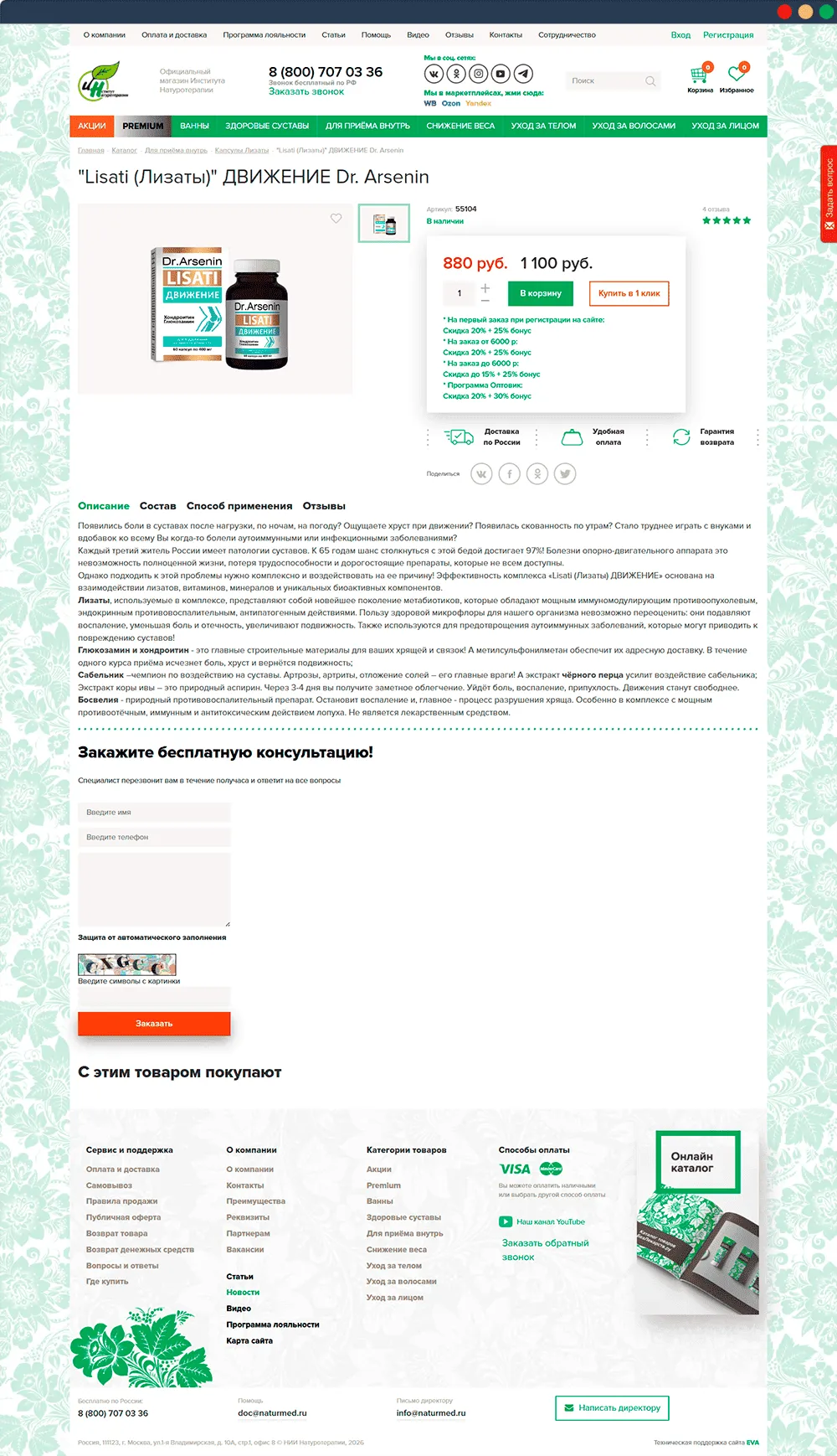 Основной нашей задачей было настроить и доработать сложную систему скидок и обмена данными с 1С, обеспечить корректную работу корзины, доставок, оплат и налогов, устранить ошибки в верстке и пользовательских сценариях, а также поддерживать сайт в актуальном и стабильном состоянии за счёт регулярных обновлений и оптимизации.